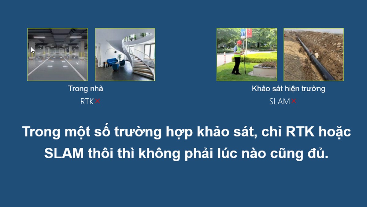 - Kết hợp công nghệ SLAM (quét và định vị trong không gian 3D mà không cần GNSS liên tục) với RTK GNSS để giữ độ chính xác hàng centimet.