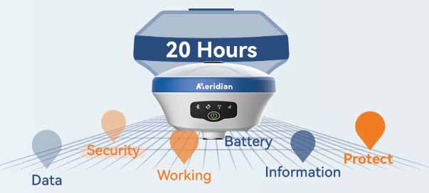 Máy GPS RTK Meridian M8 thời gian hoạt động lên 20 giờ, cho phép làm việc cả ngày, đồng thời đảm bảo dữ liệu được lưu an toàn và bảo mật thông tin quan trọng