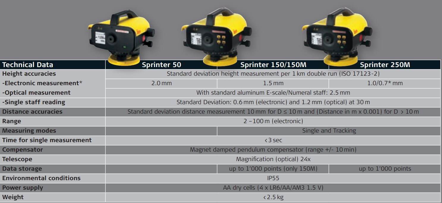 Các máy thủy bình điện tử Leica cải thiện các tiêu chuẩn để san lấp mặt bằng trên các công trường xây dựng và các nhiệm vụ khảo sát chung. Leica Sprinter 50 rất dễ sử dụng, thực hiện các phép đo nhanh chóng và giảm thiểu sai số người dùng. Kinh nghiệm cho thấy dùng máy thủy bình điện tử tiết kiệm thời gian lên đến 50%